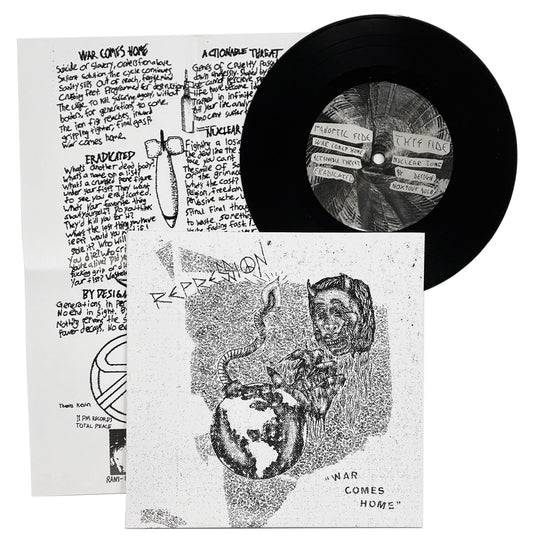 Repression: War Comes Home 7” (11PM Records) War Comes Home is the debut vinyl from this Arizona hardcore band. They had an earlier demo tape on the excellent Total Peace label, but since that recording Mike from Extended Hell and Yellowcake has joined on drums. As I said when I wrote about Yellowcake’s 7” a while back, Mike is a beastly drummer who will improve any band he’s in, and War Comes Home is indeed a powerful record. Repression’s sound is jagged and noisy, drawing from more than just a narrow spectrum of influences. Total Peace’s description of their demo mentioned Nine Shocks Terror and Deathreat, and I can hear that in War Comes Home. In the same way those 90s bands sounded like an amalgamation of everything in hardcore that had come before, Repression’s music isn’t anchored in one particular scene or style. The snotty but snarling vocals sound contemporary, with a similar catchiness as Gag or Paprika, and the guitars do everything from flanged-out noise to driving power chords to loose and chaotic leads, all three of which you can hear on the closer “Noxious Bulbs.” The mid-paced “Eradicated” is another highlight, with a strutting riff that would make your granny want to slam. While the fact that Repression doesn’t stick to one clear lane may make them a little less immediate, I love that War Comes Home doesn’t sound quite like any other record in my collection.