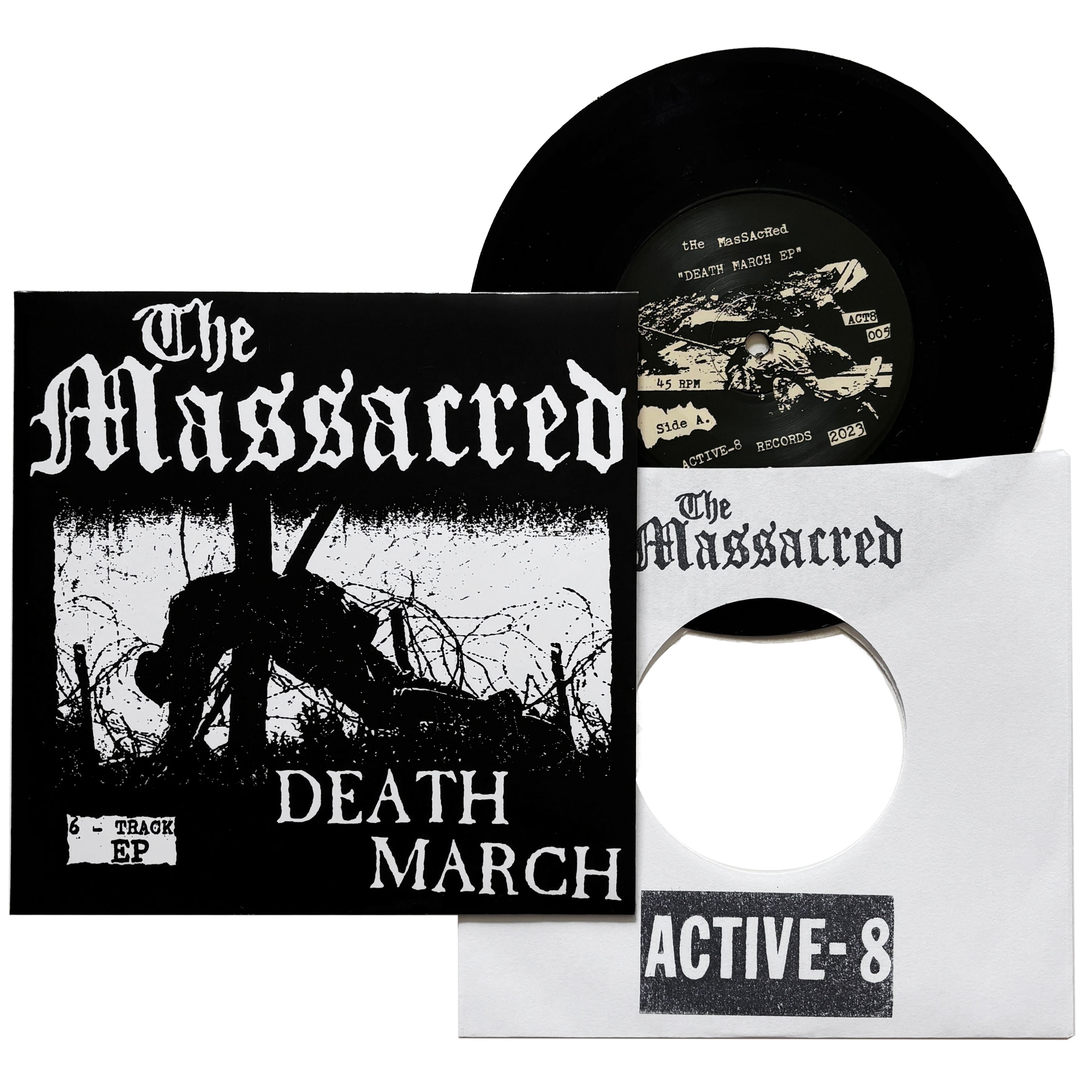 The Massacred: Death March 7” (Active-8 Records) Death March is the second EP from this Boston band, and holy fuck is it a powerful hardcore onslaught. While the Massacred’s sound and presentation are steeped in early 80s international punk, those influences feel digested and synthesized here, cooked down to a dense and ultra-potent concentrate. Jeff always mentions Headcleaners when the Massacred comes up, and I definitely hear that on Death March, particularly in the guitar playing, the way the riffs bounce around while the guitarist’s right hand barely ever deviates from this inhuman buzzsaw rhythm, the relentless pick attack captured perfectly in this raw but nuanced recording. While the riffs move around a lot, there’s straightforward pop songwriting at the core of these songs, which often build to harmonically satisfying crescendos that make me feel almost weightless. While the Massacred has made sure the bones of these songs are strong, they keep the focus on ferocity in the performance, with the bludgeoning rhythm section and caustic vocals coming from the Shitlickers school of all-out intensity. Like the music, the lyrics are grounded in convention (Discharge-style meditations on war and human savagery), but find room for subtle innovations that make them come alive, whether that’s an arresting image (“Hang them up on chains / rectal fed and bludgeoned / shine your boots sloshed in rotting green puke”) or an interesting metaphor (“Septic Appendix” casts political and military leaders as diseased organs infecting everything around them). Every second of music here, every square millimeter of artwork and packaging, feels considered and optimized for maximum intensity and impact. Highly recommended for anyone who loves a good pummeling.