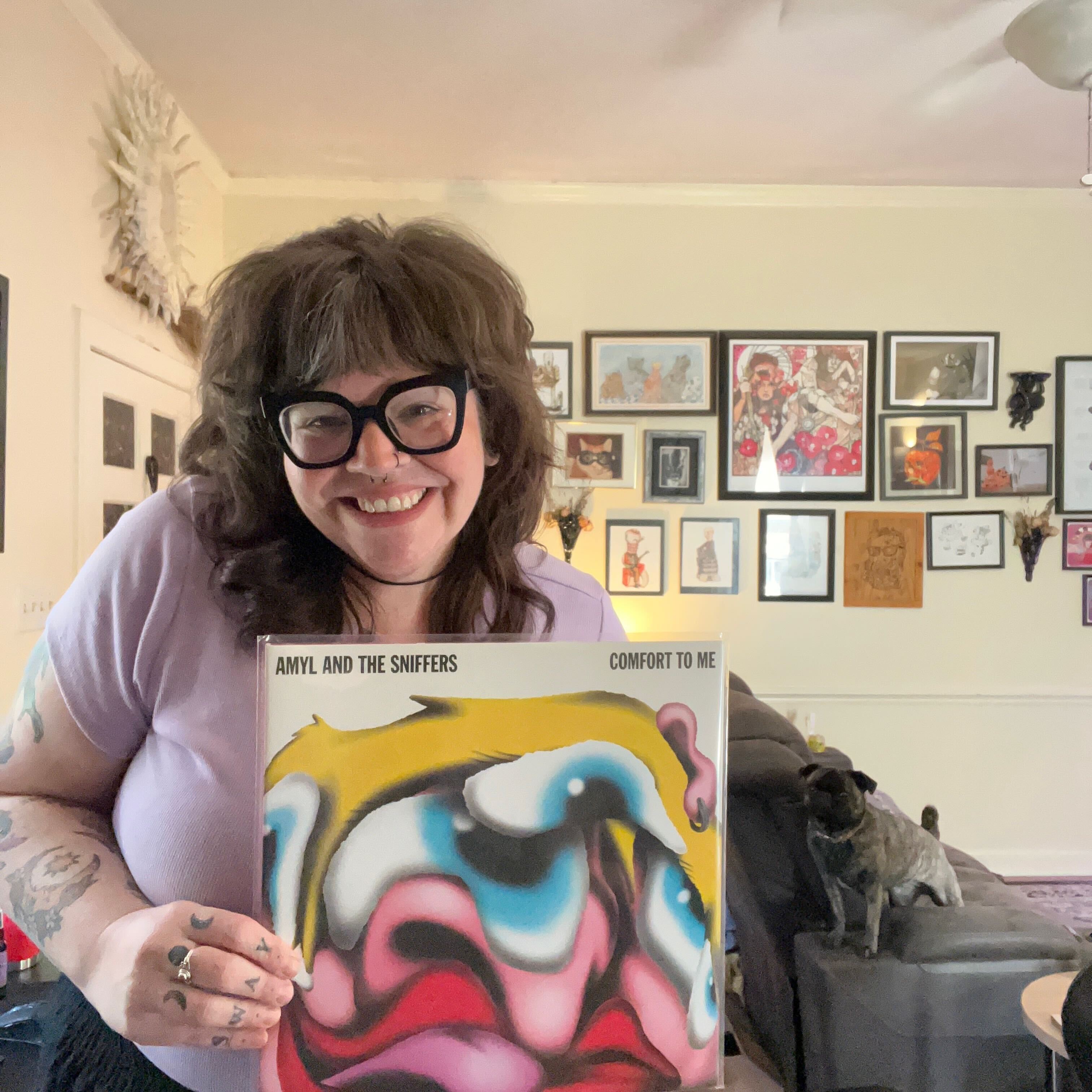 I’m Molly, Danny’s wife, a book artist and bookbinder also known as Made with Magick on Instagram. I hand-bind journals in my home studio and believe deeply in the power of the words we choose to write and keep. My work is rooted in the idea that the arts are essential to the human condition and that everyone deserves a seat at the table. I carry that into my teaching as the bookbinding instructor at the Durham Arts Council, where I try to create a space that feels welcoming, curious, and a little bit magical. Whimsy shows up in everything I do: unexpected details, playful structures, small moments of surprise, and it spills into how I move through daily life, too. Living with someone who works at a record store means music is never just background; it’s part of the texture of our home. Records come in and out constantly, stacked on tables, spinning while I’m in the studio. Some pass through. Some stick. Comfort to Me by Amyl and the Sniffers is one that stayed and is currently on constant rotation. A hyper-fixation, if you will.