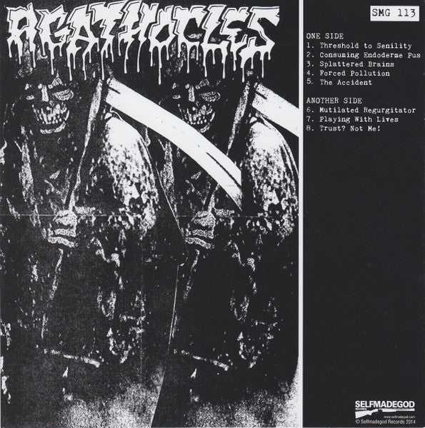 Tracklist: A1. Threshold To Senility, A2. Consuming Endoderme Pus, A3. Splattered Brains, A4. Forced Pollution, A5. The Accident, B6. Mutilated Regurgitator, B7. Playing With Lives, B8. Trust? Not Me!