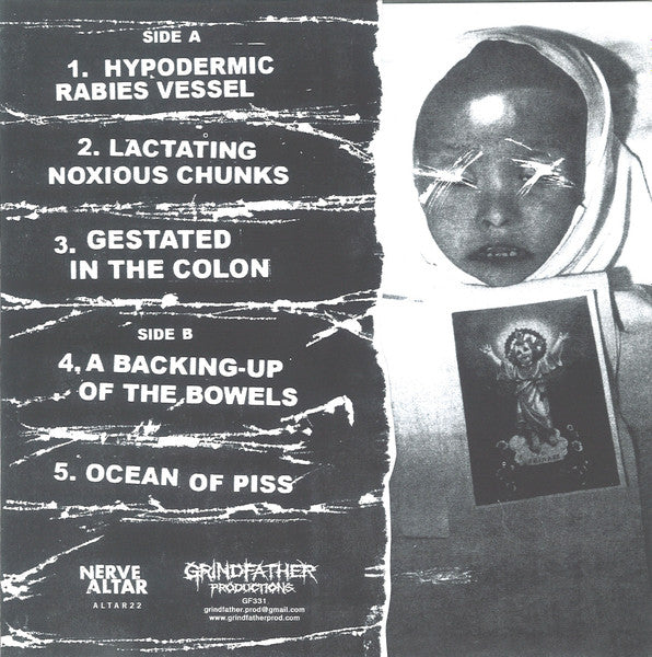 Tracklist: A1. Hypodermic Rabies Vessel, A2. Lactating Noxious Chunks, A3. Gestated In The Colon, B4. A Backing-Up Of The Bowels, B5. Ocean Of Piss