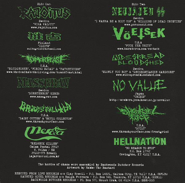 Tracklist: A1. Viha Väijyy, A2. Idiots, A3. Bludgeoner, A4. Firing Squad, A5. Patheticism, A6. Dörrterror, A7. Daisy Cutter, A8. Skull Collector, A9. Redneck Killer, B1. I Wanna Be A Riot Cop, B2. Millions Of Dead Crusties, B3. Fuck Yer Unity, B4. Slowly You Rot, B5. Dechristianize Hardcore, B6. Crisis, B7. Guilt, B8. No Reason To Stop