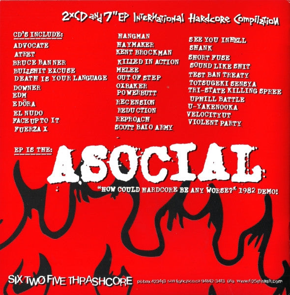 Tracklist: . Disc 1, CD1-1. The Enemy, CD1-2. FxTxWx, CD1-3. I'm A Junkie, I Wanna Die, CD1-4. Addiction, CD1-5. Wall Of Despair, CD1-6. Direction, CD1-7. Drop Dead, CD1-8. 42 Seconds, CD1-9. Facade Of Progressiveness, CD1-10. Untitled, CD1-11. Oppressed For Answer, CD1-12. Going Nowhere, CD1-13. Depression, CD1-14. Demons In My Head, CD1-15. Sorry Kids, CD1-16. Melee Thrash Attack, CD1-17. Murder, CD1-18. Mind Control, CD1-19. Power Violence Seminar For Teenagers (Live), CD1-20. Abuse Of Humanity, CD1-21. Lozenge Volley, CD1-22. Pummeling Chairshot To The Yankee Kisser Of Tony Erba, CD1-23. Six Months, CD1-24. Advertise Yourself, CD1-25. Goulag Américain, CD1-26. No Al Sistema, CD1-27. Mumbledypeg, CD1-28. The Eternal Flame Of The Wastewater Treatment Facility, CD1-29. Outside View (The Stranglehold Part 2), CD1-30. Sell By, CD1-31. Our Scene, CD1-32. Meaninglessness Of Existence, CD1-33. Jati Diri, CD1-34. Koto-Kyoto, CD1-35. Grand Mother Said..., CD1-36. Another Day Spent In Hell, CD1-37. Eat Shit, CD1-38. (Still) Not Just Boys Fun, CD1-39. A Fact You Can't Ignore, CD1-40. Still Not Punk Enough, CD1-41. Not Even Better, CD1-42. Hablando Sin Conocer, CD1-43. Juntos En El Pit, CD1-44. Sucky Crusty, CD1-45. I Can't Believe This Is Yogurt, CD1-46. Terreno De Las Ratas, CD1-47. Dios, CD1-48. Carbura, CD1-49. Eskape Del Matadero, . Disc 2, CD2-1. Stop, CD2-2. It's Free For Itself, CD2-3. The Peace That It Doesn't Get Out Of The Way, CD2-4. Arselräns, CD2-5. Change, CD2-6. Simon Says, CD2-7. Last Words, CD2-8. Eviction, CD2-9. Scene Report, CD2-10. 40 Hour Death Sentence, CD2-11. Untitled, CD2-12. Asses And Elephants, CD2-13. Magnets, CD2-14. Konami Code, CD2-15. Modern Day Election, CD2-16. Checkmate, CD2-17. Shanko's Revenge, CD2-18. Hey Bro, Lay Off The Foil Tacos, CD2-19. M.T.V.D., CD2-20. Pigsaw Puzzle, CD2-21. C1proof, CD2-22. Ein Und Zwanzigste Lied (The Curse), CD2-23. Reverse Psychology And The High-Stakes World Of Vacuum Cleaner Sales, CD2-24. ...And Watch Out For Christians!, CD2-25. Kill! Fucking! Advertising! Go!, CD2-26. I'll Take Weapons Of Self-Oppression For $200, Alex, CD2-27. This Song Is About You, CD2-28. Live Alone, And Hate It, CD2-29. Brutal Forever, CD2-30. Watchdog, CD2-31. Fuck The Kids, CD2-32. Not Pay Back, CD2-33. Could You Be So Stupid?, CD2-34. Trainwreck, CD2-35. Skate Like Shit, CD2-36. About Pleasure, Work And Shit, CD2-37. Taxi Driver, CD2-38. The Nation Of Corpse-Burners, CD2-39. Vocal Cords, CD2-40. Invitation To The Gas Chamber, CD2-41. Faded Red, CD2-42. Roadkill On The Information Superhighway, CD2-43. Future Wife-Beater, CD2-44. Dealing In Abstracts, CD2-45. Based On Two Sharing, CD2-46. Fun & Games, CD2-47. W.M.D., CD2-48. In-Som, CD2-49. Another Second Guess, CD2-50. Bruised Knuckles And Broken Hearts, CD2-51. 感覚麻痺, CD2-52. 憎悪, CD2-53. Fuck The Education, CD2-54. Teenage Riot, CD2-55. No Escape, CD2-56. No!, CD2-57. Bring Me Down, . Asocial - "How Could Hardcore Be Any Worse" 1982 Demo 7", EP-A1. Asocial Attack, EP-A2. Hardcore Song, EP-A3. Krossa Nazismen, EP-A4. Revolution, EP-A5. När Kriget Är Här, EP-A6. Samhällets Offer, EP-B1. En Död Snut, EP-B2. Bränn Din Höstsedel, EP-B3. Alternativ, EP-B4. Jag Ska Aldrig Bli Militär, EP-B5. Låt Dom Inte Lura Dig, EP-B6. Militär Diktatur, EP-B7. Religiös Moral