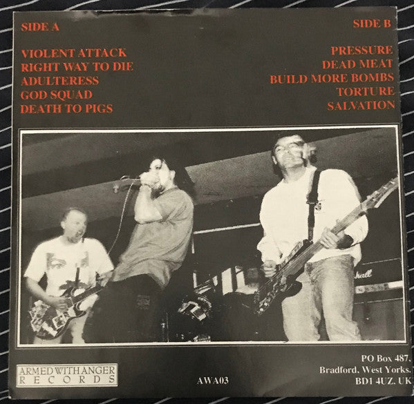 Tracklist: A1. Violent Attack, A2. Right Way To Die, A3. Adulteress, A4. God Squad, A5. Death To Pigs, B1. Pressure, B2. Dead Meat, B3. Build More Bombs, B4. Torture, B5. Salvation