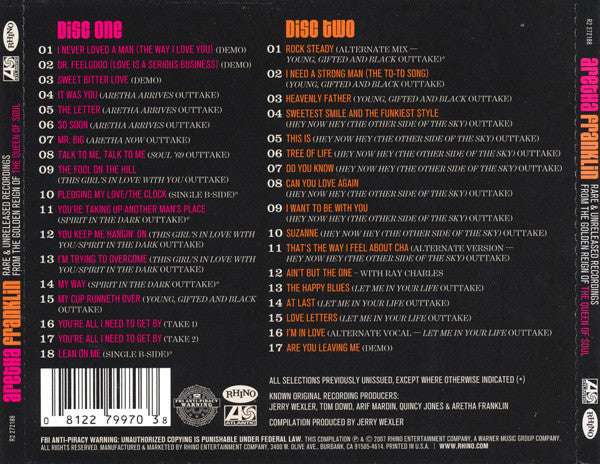 Tracklist: 1-1. I Never Loved A Man (The Way I Love You) (Demo), 1-2. Dr. Feelgood (Love Is A Serious Business (Demo), 1-3. Sweet Bitter Love (Demo), 1-4. It Was You, 1-5. The Letter, 1-6. So Soon, 1-7. Mr. Big, 1-8. Talk To Me, Talk To Me, 1-9. The Fool On The Hill, 1-10. Pledging My Love/The Clock, 1-11. You're Taking Another Man's Place, 1-12. You Keep Me Hangin' On, 1-13. I'm Trying To Overcome, 1-14. My Way, 1-15. My Cup Runneth Over, 1-16. You're All I Need To Get By (Take 1), 1-17. You're All I Need To Get By (Take 2), 1-18. Lean On Me, 2-1. Rock Steady, 2-2. I Need A Strong Man (The To-To Song), 2-3. Heavenly Father, 2-4. Sweetest Smile And The Funkiest Style, 2-5. This Is, 2-6. Tree Of Life, 2-7. Do You Know, 2-8. Can You Love Again, 2-9. I Want To Be With You, 2-10. Suzanne, 2-11. That's The Way I Feel About Cha (Alternate Version), 2-12. Ain't But The One, 2-13. The Happy Blues, 2-14. At Last, 2-15. Love Letters, 2-16. I'm In Love (Alternate Vocal), 2-17. Are You Leaving Me (Demo)