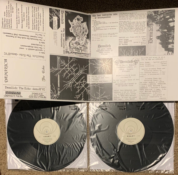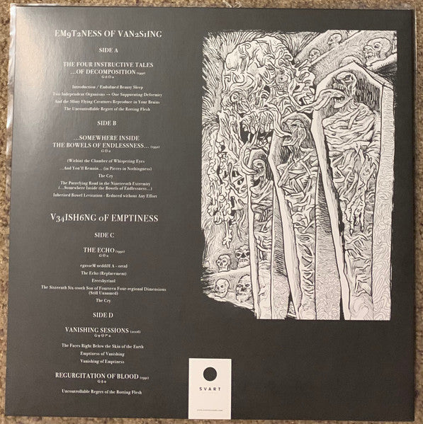 Tracklist: . The Four Instructive Tales …Of Decomposition (1991), A1. Introduction / Embalmed Beauty Sleep, A2. Two Independent Organisms → One Suppurating Deformity, A3. And The Slimy Flying Creatures Reproduce In Your Brains, A4. The Uncontrollable Regret Of The Rotting Flesh, . …Somewhere Inside The Bowels Of Endlessness… (1992), B1. (Within) The Chamber of Whispering Eyes, B2. …and You’ll Remain… (In Pieces in Nothingness), B3. The Cry, B4. The Putrefying Road In The Nineteenth Extremity (…Somewhere Inside The Bowels Of Endlessness…), B5. Inherited Bowel Levitation – Reduced Without Any Effort, . The Echo (1992), C1. Egassem Neddih A – Ortni, C2. The Echo (Replacement), C3. Erecshyrinol, C4. The Sixteenth Six-Tooth Son Of Fourteen Four-Regional Dimensions (Still Unnamed), C5. The Cry, . Vanishing Sessions (2006), D1. The Faces Right Below The Skin Of The Earth, D2. Emptiness Of Vanishing, D3. Vanishing Of Emptiness, . Regurgitation of Blood (1991), D4. Uncontrollable Regret Of The Rotting Flesh