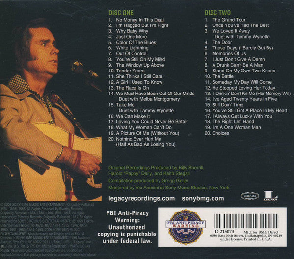 Tracklist: 1-1. No Money In This Deal, 1-2. I'm Ragged But I'm Right, 1-3. Why Baby Why, 1-4. Just One More, 1-5. Color Of The Blues, 1-6. White Lightning, 1-7. Out Of Control, 1-8. You're Still On My Mind, 1-9. The Window Up Above, 1-10. Tender Years, 1-11. She Thinks I Still Care, 1-12. A Girl I Used To Know, 1-13. The Race Is On, 1-14. We Must Have Been Out Of Our Minds, 1-15. Take Me, 1-16. We Can Make It, 1-17. Loving You Could Never Be Better, 1-18. What My Woman Can't Do, 1-19. A Picture Of Me (Without You), 1-20. Nothing Ever Hurt Me (Half As Bad As Losing You), 2-1. The Grand Tour, 2-2. Once You've Had The Best, 2-3. We Loved It Away, 2-4. The Door, 2-5. These Days (I Barely Get By), 2-6. Memories Of Us, 2-7. I Just Don't Give A Damn, 2-8. A Drunk Can't Be A Man, 2-9. Stand On My Own Two Knees, 2-10. The Battle, 2-11. Someday My Day Will Come, 2-12. He Stopped Loving Her Today, 2-13. If Drinkin' Don't Kill Me (Her Memory Will), 2-14. I've Aged Twenty Years In Five, 2-15. Still Doin' Time, 2-16. You've Still Got A Place In My Heart, 2-17. I Always Get Lucky With You, 2-18. The Right Left Hand, 2-19. I'm A One Woman Man, 2-20. Choices