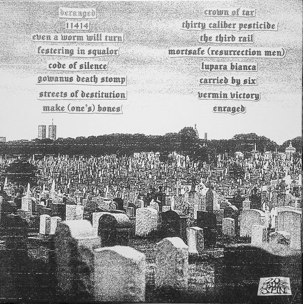 Tracklist: A1. Deranged, A2. 11414, A3. Even A Worm Will Turn, A4. Festering In Squalor, A5. Code Of Silence, A6. Gowanus Death Stomp, A7. Streets Of Destitution, A8. Make (One's) Bones, B1. Crown Of Tar, B2. Thirty Caliber Pesticide, B3. The Third Rail, B4. Mortsafe (Resurrection Men), B5. Lupara Bianca, B6. Carried By Six, B7. Vermin Victory, B8. Enraged