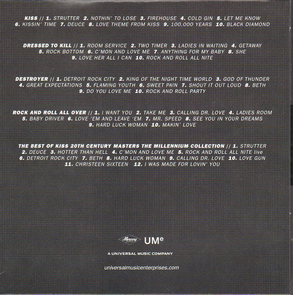 Tracklist: . KISS, 1-1. Strutter, 1-2. Nothin' To lose, 1-3. Firehouse, 1-4. Cold Gin, 1-5. Let Me Know, 1-6. Kissin' Time, 1-7. Deuce, 1-8. Love Theme From KISS, 1-9. 100.000 Years, 1-10. Black Diamond, . Dressed To Kill, 2-1. Room Service, 2-2. Two Timer, 2-3. Ladies In Waiting, 2-4. Getaway, 2-5. Rock Bottom, 2-6. C'mon And Love Me, 2-7. Anything For My Baby, 2-8. She, 2-9. Love Her All I Can, 2-10. Rock And Roll All Nite, . Destroyer, 3-1. Detroit Rock City, 3-2. King Of The Night Time World, 3-3. God Of Thunder, 3-4. Great Expectation, 3-5. Flaming Youth, 3-6. Sweet Pain, 3-7. Shout It Out Loud, 3-8. Beth, 3-9. Do You Love Me, 3-10. Rock And Roll Party, . Rock And Roll Over, 4-1. I Want You, 4-2. Take Me, 4-3. Calling Dr. Love, 4-4. Ladies Room, 4-5. Baby Driver, 4-6. Love 'em And Leave 'em, 4-7. Mr. Speed, 4-8. See You In Your Dreams, 4-9. Hard Luck Woman, 4-10. Makin' Love, . The Best Of KISS 20th Century Masters The Millennium Collection, 5-1. Strutter, 5-2. Deuce, 5-3. Hotter Than Hell, 5-4. C'mon And Love Me, 5-5. Rock And Roll All Nite (Live), 5-6. Detroit Rock City, 5-7. Beth, 5-8. Hard Luck Woman, 5-9. Calling Dr. Love, 5-10. Love Gun, 5-11. Christine Sixteen, 5-12. I Was Made For Lovin' You