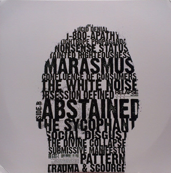 Tracklist: A1. Lucid Denial, A2. 1-800-Apathy, A3. Tightrope Propaganda, A4. Nonsense Status, A5. Tainted Righteousness, A6. Marasmus, A7. Confluence Of Consumers, A8. The White Noise, A9. Obsession Defined, B1. Abstained, B2. The Sycophant, B3. Social Disgust, B4. The Divine Collapse, B5. Submissive Manifesto, B6. Pattern, B7. Trauma & Scourge