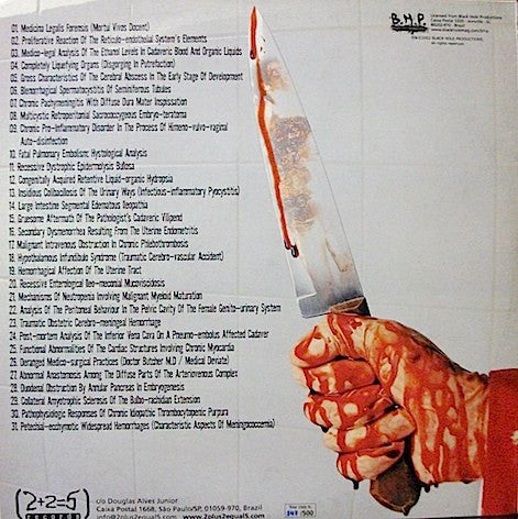 Tracklist: A1. Medicina Legalis Forensis (Mortui Vivos Docent), A2. Proliferative Reaction Of The Reticulo-Endothelial System's Elements, A3. Medico-Legal Analysis Of The Ethanol Level's In Cadaveric Blood And Organic Liquids, A4. Completely Liquefying (Disgorging In Putrefaction), A5. Gross Characteristics Of The Cerebral Abcsess In The Early Stage Of Development, A6. Blenorrhagical Spermatocystitis Of Seminiferous Tubules, A7. Chronic Pachymeningitis With Diffuse Dura Mater Inspissation, A8. Multicystic Retroperitonial Sacrococcygeous Embryo-Teratoma, A9. Chronic Pro-Inflammatory Disorder In The Process Of Himeno-Vulvo-Vaginal Auto-Disinfection, A10. Fatal Pulmonary Embolism: Hystological Analysis, A11. Recessive Dystrophic Epidermolysis Bullosa, A12. Congenitally Acquired Retentive Liquid-Organic Hydropsia, A13. Insidious Colibacillosis Of The Urinary Ways (Infectious-Inflammatory Pyocystities), A14. Large Intestine Segmental Edematous Ileopathia, A15. Gruesome Aftermath Of The Pathologist's Cadaveric Vilipend, A16. Secondary Dysmenorrhea Resulting From The Uterine Endometritis, A17. Malignant Intravenous Obstruction In Chronic Phlebothrombosis, B1. Hypothalamous Infundibulo Syndrome (Traumatic Cerebro-Vascular Accident), B2. Hemorrhagical Affection Of The Uterine Tract, B3. Recessive Enterological Ileo-Meconial Mucoviscidosis, B4. Mechanisms Of Neutropenia Involving Malignant Myeloid Maturation, B5. Analysis Of The Peritoneal Behavior In The Pelvic Cavity Of The Female Genito-Urinary System, B6. Traumatic Obstetric Cerebro-Meningeal Hemorrhage, B7. Post-Mortem Analysis Of The Inferior Vena Cava On A Pneumo-Embolous Affected Cadaver, B8. Functional Abnormalities Of The Cardiac Structures Involving Chronic Myocardias, B9. Deranged Medico-Surgical Practices (Doctor Butcher M.D/ Medical Deviante), B10. Abnormal Anastomosis Among The Diffuse Parts Of The Arteriovenous Complex, B11. Duodenal Obstruction By Annular Pancreas In Embryogenesis, B12. Collateral Amyotrophic Sclerosis Of The Bulbo-Rachidian Extension, B13. Pathophysiologic Responses Of Chronic Idiopathic Thrombocytopenic Purpura, B14. Petechial-Ecchymotic Widespread Hemorrhages (Characteristic Aspects Of Meningococcemia)