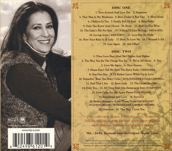 Tracklist: 1-1. Turn Around And Love You, 1-2. Superstar, 1-3. That Man Is My Weakness, 1-4. Born Under A Bad Sign, 1-5. Mud Island, 1-6. I Believe In You, 1-7. Family Full Of Soul, 1-8. Nice Feelin', 1-9. Only You Know And I Know, 1-10. Fever, 1-11. Bird On A Wire, 1-12. The Lady's Not For Sale, 1-13. A Song I'd Like To Sing, 1-14. Loving Arms, 1-15. Love Has No Pride, 1-16. Now Your Baby Is A Lady, 1-17. Born To Love Me, 1-18. I Wanted It All, 1-19. Late Again, 1-20. Am I Blue?, 2-1. (Your Love Has Lifted Me) Higher And Higher, 2-2. The Way You Do The Things You Do, 2-3. We're All Alone, 2-4. You, 2-5. Love Me Again, 2-6. Slow Dancer, 2-7. Please Don't Tell Me How The Story Ends, 2-8. One Fine Day, 2-9. I'd Rather Leave While I'm In Love, 2-10. Somethin' Bout You Baby I Like, 2-11. Fool That I Am, 2-12. Basic Lady, 2-13. The Closer You Get, 2-14. Only You, 2-15. All Time High (Theme Song From Octopussy), 2-16. Love Came For Me (Love Them From Splash), 2-17. Something Said Love, 2-18. Survivor, 2-19. Perfect Strangers, 2-20. Cherokee, 2-21. The Way I Love You