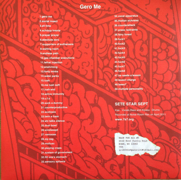 Tracklist: A1. Gero Me, A2. Social Insect, A3. All Time, A4. Schizo Hrenia, A5. Prayer Prayer, A6. Absolute Zero, A7. Supporters Of Euthanasia, A8. Waiting Room, A9. Endless Path, A10. Gas Chamber Executions, A11. Lethal Injection, A12. Enshrining, A13. Forty Minks, A14. Water Parks, A15. Lush, A16. Me Lush Soft, A17. Lush End, A18. Active Immunity, A19. U.F.O., A20. Suck A Dummy, A21. Counterproductive, A22. Scoliosis, A23. Bein A Haze, A24. Shi Talks Silence, A25. Dust Bowl, A26. Windswept, A27. Vamoose, A28. Zip Zag, A29. Mollusc, A30. Playing Craps, A31. System Of Government, A32. Gill One's Stomach, A33. Sensory Aphasia, B34. Vocal Apparatus, B35. Motion Sickness, B36. Counterattack, B37. Press Restraints, B38. Fairy Forest, B39. Fuck1, B40. Fuck2, B41. Fuck3, B42. Fuck4, B43. Fuck5, B44. Fuck6, B45. Fuck7, B46. Fuck8, B47. He Needs A Lesson, B48. Lesson Charge, B49. Lseeo7, B50. Multiple Personality