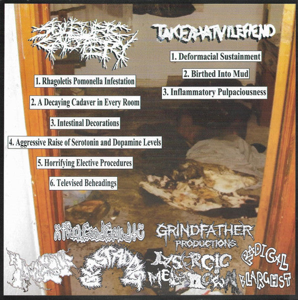 Tracklist: A1. Rhagoletis Pomonella Infestation, A2. A Decaying Cadaver In Every Room, A3. Intestinal Decorations, A4. Aggressive Raise Of Serotonin And Dopamine Levels, A5. Horrifying Elective Procedures, A6. Televised Beheadings, B1. Deformacial Sustainment, B2. Birthed Into Mud, B3. Inflammatory Pulpaciousness