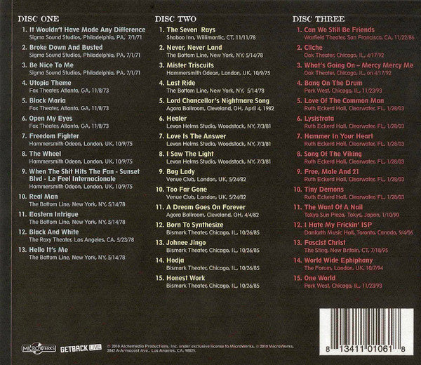 Tracklist: . Volume One, 1-1. It Wouldn't Have Made Any Difference, 1-2. Broke Down And Busted, 1-3. Be Nice To Me, 1-4. Utopia Theme, 1-5. Black Maria, 1-6. Open My Eyes, 1-7. Freedom Fighter, 1-8. The Wheel, 1-9. When The Shit Hits The Fan - Sunset Blvd - Le Fee Internacionale, 1-10. Real Man, 1-11. Eastern Intrigue, 1-12. Black And White, 1-13. Hello It's Me, . Volume Two, 2-1. The Seven Rays, 2-2. Never, Never Land, 2-3. Mister Triscuits, 2-4. Last Ride, 2-5. Lord Chancellor's Nightmare Song, 2-6. Healer, 2-7. Love Is The Answer, 2-8. I Saw The Light, 2-9. Bag Lady, 2-10. Too Far Gone, 2-11. A Dream Goes On Forever, 2-12. Born To Synthesize, 2-13. Johnee Jingo, 2-14. Hodja, 2-15. Honest Work, . Volume Three, 3-1. Can We Still Be Friends, 3-2. Cliche, 3-3. What's Going On - Mercy Mercy Me, 3-4. Bang On The Drum, 3-5. Love Of The Common Man, 3-6. Lysistrata, 3-7. Hammer In Your Heart, 3-8. Song Of The Viking, 3-9. Free, Male And 21, 3-10. Tiny Demons, 3-11. The Want Of A Nail, 3-12. I Hate My Frickin' ISP, 3-13. Fascist Christ, 3-14. World Wide Epiphany, 3-15. One World