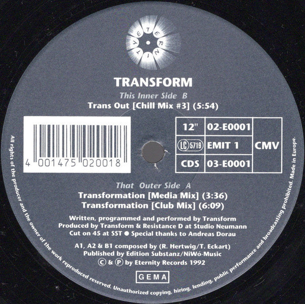 Tracklist: A1. Transformation (Media Mix), A2. Transformation (Club Mix), B. Trans Out (Chill Mix #3)