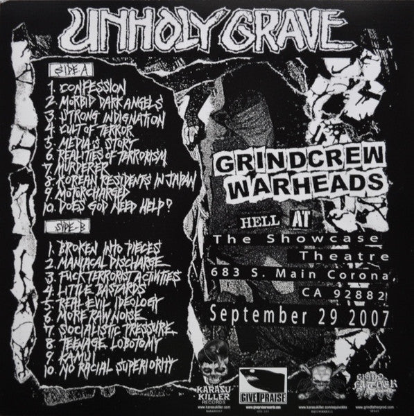 Tracklist: A1. Confession, A2. Morbid Dark Angels, A3. Strong Indignation, A4. Cult Of Terror, A5. Media's Story, A6. Realities Of Terrorism, A7. Murderer, A8. Korean Residents In Japan, A9. Motorcharged, A10. Does God Need Help?, B1. Broken Into Pieces, B2. Maniacal Discharge, B3. Fuck Terrorist Activities, B4. Little Bastards, B5. Real Evil Ideology, B6. More Raw Noise, B7. Socialistic Pressure, B8. Teenage Lobotomy, B9. Kamui, B10. No Racial Superiority