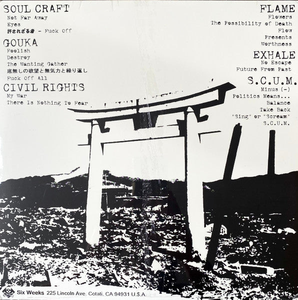 Tracklist: A1. Not Far Away, A2. Eyes, A3. 許されざる者 - Fuck Off, A4. Foolish, A5. Destroy, A6. The Wanting Gather, A7. 底無しの欲望と無気カと繰り返し, A8. Fuck Off All, A9. My War, A10. There Is Nothing To Fear, B1. Flowers, B2. The Possibility Of Death, B3. Flow, B4. Presents, B5. Worthness, B6. No Escape, B7. Future From Past, B8. Minus (-), B9. Politics Means..., B10. Balance, B11. Take Back, B12. "Sing" Or "Scream", B13. S.C.U.M.