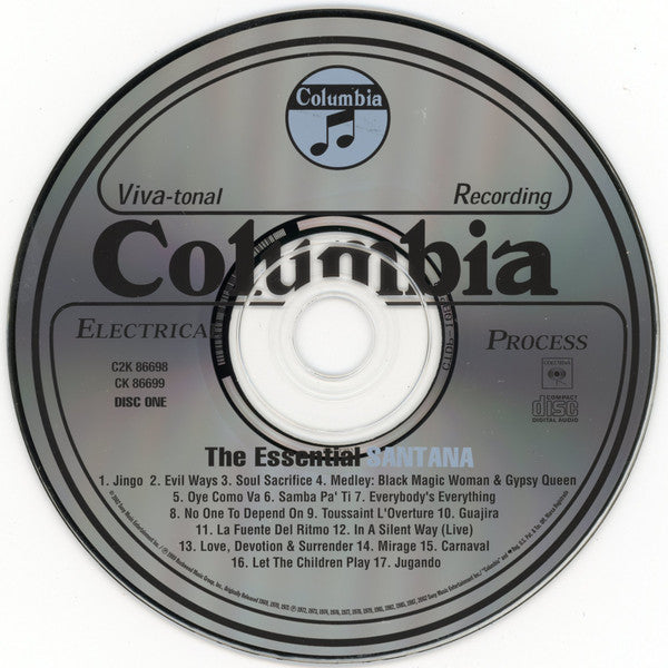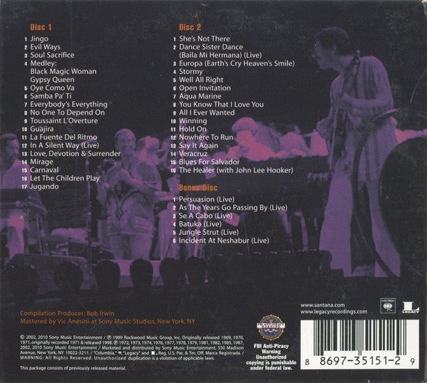 Tracklist: 1-01. Jingo, 1-02. Evil Ways, 1-03. Soul Sacrifice, 1-04. Medley: Black Magic Woman / Gypsy Queen, 1-05. Oye Como Va, 1-06. Samba Pa' Ti, 1-07. Everybody's Everything, 1-08. No One To Depend On, 1-09. Toussaint L'Overture, 1-10. Guajira, 1-11. La Fuente Del Ritmo, 1-12. In A Silent Way (Live), 1-13. Love, Devotion & Surrender, 1-14. Mirage, 1-15. Carnaval, 1-16. Let The Children Play, 1-17. Jugando, 2-01. She's Not There, 2-02. Dance Sister Dance (Baila Mi Hermana) (Live), 2-03. Europa (Earth's Cry Heaven's Smile), 2-04. Stormy, 2-05. Well All Right, 2-06. Open Invitation, 2-07. Aqua Marine, 2-08. You Know That I Love You, 2-09. All I Ever Wanted, 2-10. Winning, 2-11. Hold On, 2-12. Nowhere To Run, 2-13. Say It Again, 2-14. Veracruz, 2-15. Blues For Salvador, 2-16. The Healer, 3-1. Persuasion (Live), 3-2. As The Years Go By (Live), 3-3. Se A Cabo (Live), 3-4. Batuka (Live), 3-5. Jungle Strut (Live), 3-6. Incident At Neshabur (Live)
