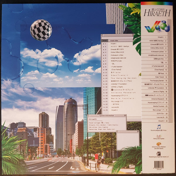 Tracklist: A1. Hiraeth I, A2. A500〔緑死〕Gensys, A3. Emerald 都市 2070, A4. Online Office V4.20, A5. Icolluseum山Dew, A6. info@Maneki-neko.net, A7. 羽雨Apple Abc, A8. 「庭」, A9. ☆Turtle Islands☀, A10. [Twin Palms], A11. 春 Plaza, A12. Eden Transit, B13. The Hanging Garden, B14. 臨海都市ボーダム 52 アロエ, B15. Umbrella ☂ Foundation, B16. Verne↹Flights, B17. ▒▓Madobe ガールフレンド, B18. Antenna Research, B19. Aquascaping ピラミッド, B20. Marble Fountain, B21. Sky Lounge 〽ぺ, B22. ・おやすみ・, B23. Lacunalife, B24. Hiraeth II