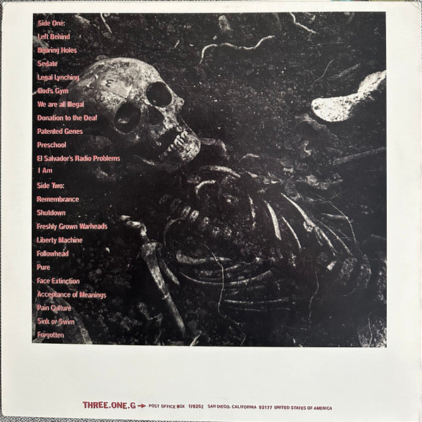 Tracklist: A1. Left Behind, A2. Bearing Holes, A3. Sedate, A4. Legal Lynching, A5. God´s Gym, A6. We Are All Illegal, A7. Donation To The Deaf, A8. Patented Genes, A9. Preschool, A10. El Salvador´s Radio Problems, A11. I Am, B1. Remembrance, B2. Shutdown, B3. Freshly Grown Warheads, B4. Liberty Machine, B5. Followhead, B6. Pure, B7. Face Extinction, B8. Acceptance Of Meanings, B9. Pain Culture, B10. Sink Or Swim, B11. Forgotten