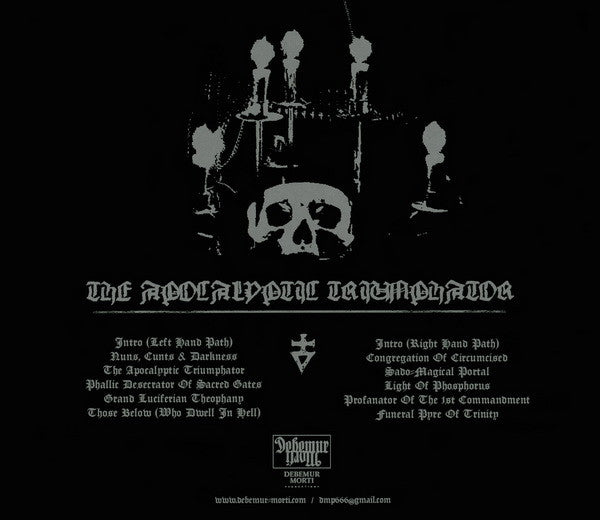 Tracklist: 1. Intro (Left Hand Path), 2. Nuns, Cunts & Darkness, 3. The Apocalyptic Triumphator, 4. Phallic Desecrator Of Sacred Gates, 5. Grand Luciferian Theophany, 6. Those Below (Who Dwell In Hell), 7. Intro (Right Hand Path), 8. Congregation Of Circumcised, 9. Sado-Magical Portal, 10. Light Of Phosphorus, 11. Profanator Of The 1st Commandment, 12. Funeral Pyre Of Trinity