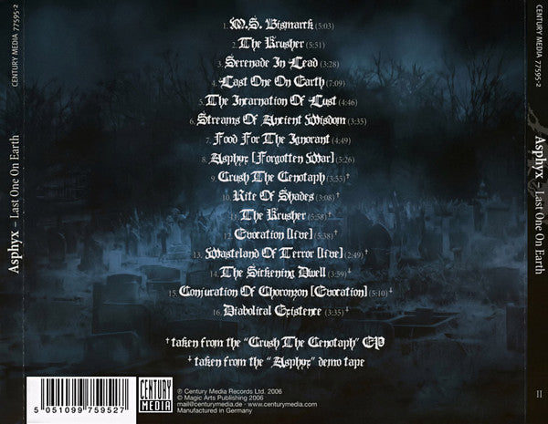 Tracklist: 1. M.S. Bismarck, 2. The Krusher, 3. Serenade In Lead, 4. Last One On Earth, 5. The Incarnation Of Lust, 6. Streams Of Ancient Wisdom, 7. Food For The Ignorant, 8. Asphyx [Forgotten War], . Crush The Cenotaph EP '92, 9. Crush The Cenotaph, 10. Rite Of Shades, 11. The Krusher, 12. Evocation [Live], 13. Wasteland Of Terror [Live], . Promo '91, 14. The Sickening Dwell, 15. Conjuration Of Choronzon [Evocation], 16. Diabolical Existence