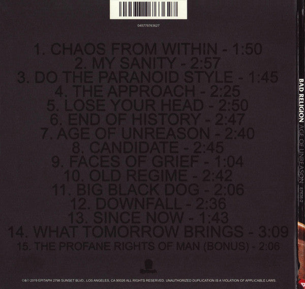 Tracklist: 1. Chaos From Within, 2. My Sanity, 3. Do The Paranoid Style, 4. The Approach, 5. Lose Your Head, 6. End Of History, 7. Age Of Unreason, 8. Candidate, 9. Faces Of Grief, 10. Old Regime, 11. Big Black Dog, 12. Downfall, 13. Since Now, 14.1. What Tomorrow Brings, 14.2. The Kids Are Alt-Right, 15. The Profane Rights Of Man (Bonus)