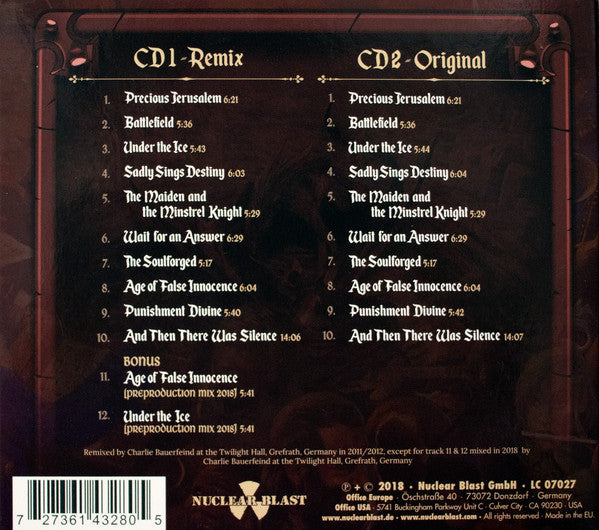 Tracklist: . CD1 Remix, 1-1. Precious Jerusalem, 1-2. Battlefield, 1-3. Under The Ice, 1-4. Sadly Sings Destiny, 1-5. The Maiden And The Minstrel Knight, 1-6. Wait For An Answer, 1-7. The Soulforged, 1-8. Age Of False Innocence, 1-9. Punishment Divine, 1-10. And Then There Was Silence, . Bonus, 1-11. Age Of False Innocence (preproduction mix 2018), 1-12. Under The Ice (preproduction mix 2018), . CD2 Original, 2-1. Precious Jerusalem, 2-2. Battlefield, 2-3. Under The Ice, 2-4. Sadly Sings Destiny, 2-5. The Maiden And The Minstrel Knight, 2-6. Wait For An Answer, 2-7. The Soulforged, 2-8. Age Of False Innocence, 2-9. Punishment Divine, 2-10. And Then There Was Silence