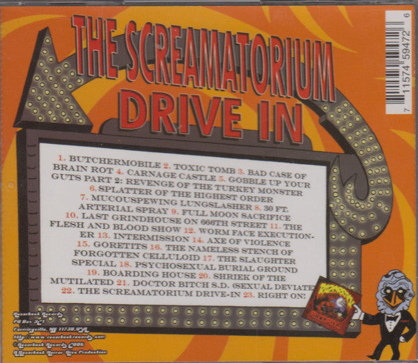 Tracklist: 1. Butchermobile, 2. Toxic Tomb, 3. Bad Case Of Brain Rot, 4. Carnage Castle, 5. Gobble Up Your Guts Part 2: Revenge Of The Turkey Monster, 6. Splatter Of The Highest Order, 7. Mucouspewing Lungslasher, 8. 30 Ft. Arterial Spray, 9. Full Moon Sacrifice, 10. Last Grindhouse On 666th Street, 11. The Flesh And Blood Show, 12. Worm Face Executioner, 13. Intermission, 14. Axe Of Violence, 15. Goretits, 16. The Nameless Stench Of Forgotten Celluloid, 17. The Slaughter Special, 18. Psychosexual Burial Ground, 19. Boarding House, 20. Shriek Of The Mutilated, 21. Doctor Bitch S.D. (Sexual Deviate), 22. The Screamatorium Drive-in, 23. Right On!