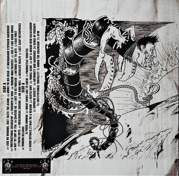 Tracklist: A1. Lick No Wounds, Just Taste The Blood, A2. Bring Me His Head, A3. Washboard Stomach Obedience, A4. Multinational Deadcamp, A5. Freedom Is Mine, A6. Modern War Pacifist, A7. Use It Like Hard Drugs, A8. Not My Cup Of Tea, A9. Civilise Us, A10. Lost To Us Forever, A11. Nothing Left To Bite, A12. Face First, A13. Paper Cuts, A14. Idealogical Suicide, A15. No Own Will, A16. Desolate Realm, A17. Last Gasp Enterprises, A18. Modern Killings, B1. Fried Horror, B2. What Cows Like To Chew, B3. Productive Minutes, B4. Scene Rituals, B5. Give Me A Reason, B6. Exotic Dirt, B7. Moral Slide, B8. Got A Brand New Kalasjnikof, B9. Supreme Society, B10. Authority And Obedience, B11. Sense Of Freedom, B12. Institutional Mentality, B13. Under The Chainsaw, B14. VFW