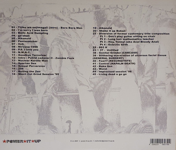 Tracklist: 1. Tijiku Wa Nejimagali (Intro) - Bara Bara Man, 2. I'm Sorry I Was Born, 3. Boric Acid Dumpling, 4. Ga-Shall, 5. Alkanoid, 6. Penisnatcher, 7. Itch, 8. Nirvana 1999, 9. P.S. I Love You, 10. N.M.A.C., 11. Goodbye Terrorizer, 12. Intro - Putrid Cadaver II - Zombie Fuck, 13. Nuclear Karate Man, 14. Spartan Sex, 15. Sexual Perversion, 16. 256, 17. Rolling The Zen, 18. Short Cut Grind Sessions '95, 19. Alkanoid, 20. Shake It Up Bokan, 21. Diversion Of Former Customary Trite Composition, 22. 893 K, 23. Untitled, 24. Untitled, 25. Untitled, 26. Untitled, 27. Untitled, 28. Untitled, 29. Untitled, 30. Untitled, 31. Untitled, 32. Untitled, 33. Untitled, 34. Untitled, 35. Untitled, 36. Untitled, 37. Untitled, 38. Genital Grinder, 39. Slithering Maceration Of Ulcerous Facial Tissue, 40. Fear!?, 41. Control, 42. Baka Sen, 43. Worst, 44. Improvised Session '98, 45. Living Dead A Go Go