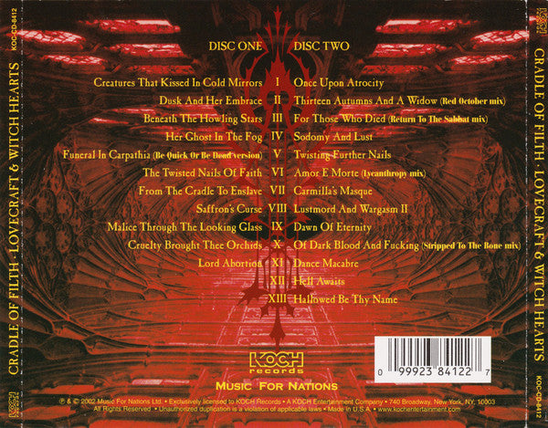 Tracklist: . Lovecraft, 1-I. Creatures That Kissed In Cold Mirrors, 1-II. Dusk And Her Embrace, 1-III. Beneath The Howling Stars, 1-IV. Her Ghost In The Fog, 1-V. Funeral In Carpathia (Be Quick Or Be Dead Version), 1-VI. The Twisted Nails Of Faith, 1-VII. From The Cradle To Enslave, 1-VIII. Saffron's Curse, 1-IX. Malice Through The Looking Glass, 1-X. Cruelty Brought Thee Orchids, 1-XI. Lord Abortion, . Witch Hearts, 2-I. Once Upon Atrocity, 2-II. Thirteen Autumns And A Widow (Red October Mix), 2-III. For Those Who Died (Return To The Sabbat Mix), 2-IV. Sodomy And Lust, 2-V. Twisting Further Nails, 2-VI. Amor E Morte (Lycanthropy Mix), 2-VII. Carmilla's Masque, 2-VIII. Lustmord And Wargasm II, 2-IX. Dawn Of Eternity, 2-X. Of Dark Blood And Fucking (Stripped To The Bone Mix), 2-XI. Dance Macabre, 2-XII. Hell Awaits, 2-XIII. Hallowed Be Thy Name