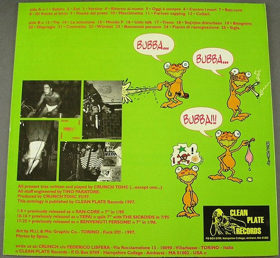 Tracklist: A1. Subito, A2. Zot, A3. Vortice, A4. Ritorno Al Nuovo, A5. Oggi É Sempre, A6. Contro I Muri, A7. Ran-core, A8. Di Fronte Al Bivio, A9. Poesie Dal Prato, A10. Macchinetta, A11. Furioso Zapping, A12. Collari, B1. Tre, B2. La Soluzione, B3. Mondo F, B4. Uolc Laik, B5. Treno, B6. So(n)no Disturbato, B7. Bisognino, B8. Dispregio, B9. Contratto, B10. Würstel, B11. Benvenute Persone, B12. Pianto Di Rassegnazione, B13. Sigla