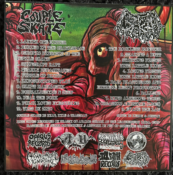 Tracklist: A1. Larynx One Hitter, A2. Buried In The Crawlspace, A3. Chronic Fibrosis Of The Penile Gland, A4. Skingraft Raft, A5. Nearly Depacitated, A6. Puddle Of Bludd, A7. Liposuctioned Flat, A8. Clint Marlachuk, A9. Formaldehyde N Seep, A10. Fear The Fork, A11. Fulci Loves Eyegouging, A12. Wigs By Zito, B1. The Rockless Monster, B2. Sharing A Butt, B3. Starting Fights With Little Kids, B4. Losing Fights With Little Kids, B5. Baja Blastbeats And Extreme Resin Production, B6. Ballhog, B7. Mind Altering Thugs, B8. Orgasmic Abortion, B9. Evade The Law