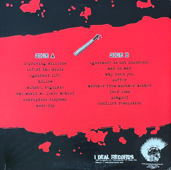 Tracklist: A1. Depriving Millions, A2. Infest The Minds, A3. Ignorant Life, A4. Hollow, A5. Mutate, Regulate, A6. The World We Leave Behind, A7. Corruption Disposal, A8. Anti-Cop (Sepultura Cover), B1. Ignorance Is Not Innocence, B2. War On War, B3. Why Don't You (Infest Cover), B4. Suffer, B5. Brother From Another Mother, B6. Your Loss, B7. Plagued, B8. Conflict Resolution