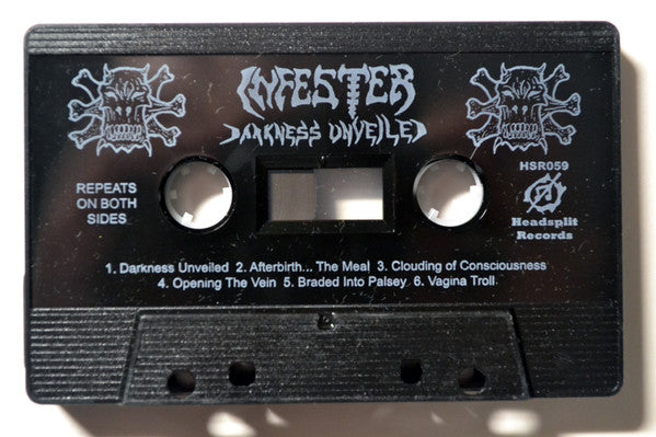 Tracklist: A1. Darkness Unveiled , A2. Afterbirth... The Meal , A3. Clouding Of Consciousness , A4. Open The Vein , A5. Braded Into Palsy, A6. Vagina Troll, B1. Darkness Unveiled, B2. Afterbirth... The Meal, B3. Clouding Of Consciousness, B4. Open The Vein, B5. Braded Into Palsy, B6. Vagina Troll