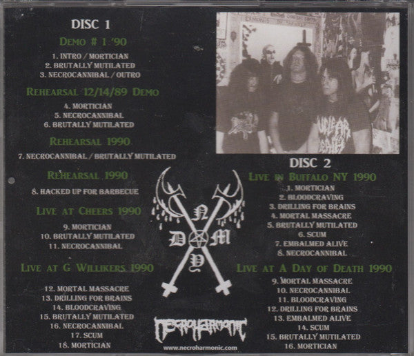 Tracklist: . Demo # 1 '90, 1-1. Intro / Mortician, 1-2. Brutally Mutilated, 1-3. Necrocannibal / Outro, . Rehearsal 12/14/89 Demo, 1-4. Mortician, 1-5. Necrocannibal, 1-6. Brutally Mutilated, . Rehearsal 1990, 1-7. Necrocannibal / Brutally Mutilated, . Rehearsal 1990, 1-8. Hacked Up For Barbecue, . Live At Cheers 1990, 1-9. Mortician, 1-10. Brutally Mutilated, 1-11. Necrocannibal, . Live At G Willikers 1990, 1-12. Mortal Massacre, 1-13. Drilling For Brains, 1-14. Bloodcraving, 1-15. Brutally Mutilated, 1-16. Necrocannibal, 1-17. Scum , 1-18. Mortician, . Live In Buffalo NY 1990, 2-1. Mortician, 2-2. Bloodcraving, 2-3. Drilling For Brains, 2-4. Mortal Massacre, 2-5. Brutally Mutilated, 2-6. Scum , 2-7. Embalmed Alive, 2-8. Necrocannibal, . Live At Day Of Death 1990, 2-9. Mortal Massacre, 2-10. Necrocannibal, 2-11. Bloodcraving, 2-12. Drilling For Brains, 2-13. Embalmed Alive, 2-14. Scum , 2-15. Brutally Mutilated, 2-16. Mortician