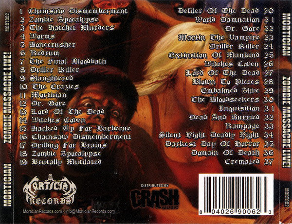 Tracklist: 1. Chainsaw Dismemberment, 2. Zombie Apocalypse, 3. The Hatchet Murders, 4. Worms, 5. Bonecrusher, 6. Redrum, 7. The Final Bloodbath, 8. Driller Killer, 9. Slaughtered, 10. The Crazies, 11. Mortician, 12. Dr. Gore, 13. Lord Of The Dead, 14. Witches Coven, 15. Hacked Up For Barbecue, 16. Chainsaw Dismemberment, 17. Drilling For Brains, 18. Zombie Apocalypse, 19. Brutally Mutilated, 20. Defiler Of The Dead, 21. World Damnation, 22. Dr. Gore, 23. Martin The Vampire, 24. Driller Killer, 25. Extinction Of Mankind, 26. Witches Coven, 27. Lord Of The Dead, 28. Blown To Pieces, 29. Embalmed Alive, 30. The Bloodseekers, 31. Inquisition, 32. Dead And Burried, 33. Rampage, 34. Silent Night Deadly Night, 35. Darkest Day Of Horror, 36. Domain Of Death, 37. Cremated