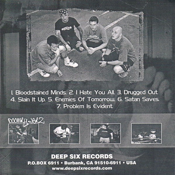 Tracklist: A1. Bloodstained Minds, A2. I Hate You All, A3. Drugged Out, A4. Slain It Up, B1. Enemies Of Tomorrow, B2. Satan Saves, B3. Problem Is Evident