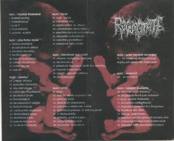 Tracklist: . Rgte / Vaginal Massaker, A1. Morbid Reality, A2. Terror Reign, A3. Fear, A4. Desensitized, A5. Generic Words, . Rgte / Psychotic Noise, A6. Brainscrambler, A7. Regurgitated Giblets, A8. Internal Bleeding, A9. Methylated Bile, A10. Liquid Excrements, A11. Carnal Cacophony, A12. Vomit Breath, A13. Suicide, . Rgte / Grudge, A14. Corpse Allergy, A15. Sickening Thoughts, A16. Visceral Organ, A17. Cadaveric Dissolution, A18. Ulcerated Flesh, A19. Deteriorated, A20. Regurgitated Giblets, A21. Matted Fungus, A22. Septicaemic Mutation, A23. Disinterring Urine, A24. Methylated Bile, A25. Pancreatic Juices, A26. Scorched Entrails, . Rgte / Dead, A27. Cyst-Eater, A28. Exhumed Love, A29. Septic Vomit Of Chyme, A30. Cannibalistic Miscarriage, A31. Praedilectio For Menorrhagia, A32. Orgasmic Convulsions, A33. Expelling Pyorrhoea, B34. Purulent Vulvectomy, . Rgte / Intestinal Infection, B35. Chronic Lymphatic Leukemie, B36. Mental Ulcer, B37. Purulent Discharge From The Urethra, B38. Vaginal Obstruction, B39. Cloudy Grayish Vomitus, B40. Fleshmangler, . Rgte / Filth, B41. Intro, B42. You're About To Fuckin Die, B43. Pierced Stiffs, B44. Braindead Amputation, B45. Festering Embryonic Vomit, B46. Relentless Pursuit Of Rotting Flesh, B47. 37 Stabwounds, B48. Stinking Genital Warts, B49. Foetal Putrefaction, B50. No Fuckin Title Bitch, . Rgte / Gore Beyond Necropsy (9 Cutz Of Bludgeoningly Depraved Grindcore Holocaust), B51. Untitled, B52. Untitled, B53. Untitled, B54. Untitled, B55. Untitled, B56. Untitled, B57. Untitled, B58. Untitled, B59. Untitled, . Rgte / Realized, B60. Humiliated In Your Own Blood, B61. Mayhamic Butchering Abortions, B62. Bloody Pile Of Human Waste, B63. Reek And Decay, B64. Choked In Shit, B65. Just Another Stillborn, B66. I Wanna Kill, B67. Robbed Of Your Bowels, B68. Funeral Genocide, . Rgte / Cripple Bastards, B69. Obscene Body Slayings, B70. Desperate Need For Violation, B71. Rage Against Humanity, B72. Retarded Coprophagist, B73. Ruptured Remains In A Doggybag, B74. Headless She Died, B75. Savage Gorewhore, B76. Impaled And Decapitated Fucking Slut, B77. Ferocious Human Body Tormentor, B78. Smeared With Bloodmixed Semen