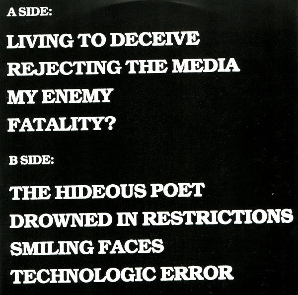 Tracklist: A1. Living To Deceive, A2. Rejecting The Media, A3. My Enemy, A4. Fatality?, B1. The Hideous Poet, B2. Drowned In Restrictions, B3. Smiling Faces, B4. Technologic Error