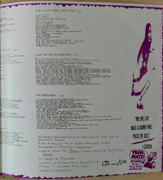 Tracklist: A1. Filthy Habit, A2. Gamma 694, A3. Turkish Revenge, A4. Simulate To Stimulate, A5. Can't Stem The Flow, A6. Conservatorium Crematorium, B1. Third World Punk, B2. It's A Bitch And Only You, B3. Cum In The Milkbottle, B4. The Mercenary