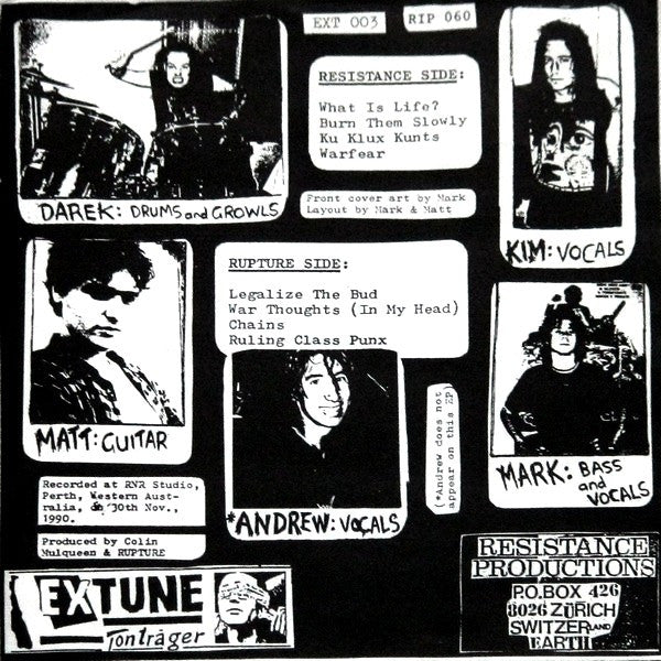 Tracklist: . Resistance Side, A1. What Is Life?, A2. Burn Them Slowly, A3. Ku Klux Kunts, A4. Warfear, . Rupture Side, B1. Legalize The Bud, B2. War Thoughts (In My Head), B3. Chains, B4. Ruling Class Punx