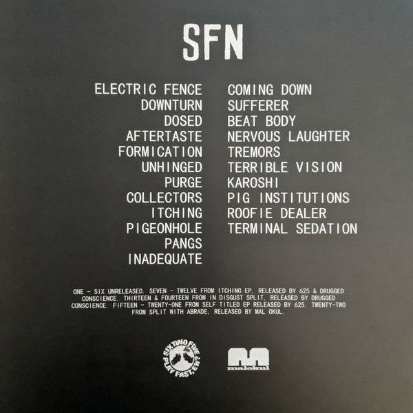Tracklist: A1. Electric Fence, A2. Downturn, A3. Dosed, A4. Aftertaste, A5. Formication, A6. Unhinged, A7. Purge, A8. Collectors, A9. Itching, A10. Pigeonhole, A11. Pangs, A12. Inadequate, B1. Coming Down, B2. Sufferer, B3. Beat Body, B4. Nervous Laughter, B5. Tremors, B6. Terrible Vision, B7. Karoshi, B8. Pig Institutions, B9. Roofie Dealer, B10. Terminal Sedation