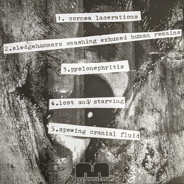 Tracklist: A1. Cornea Lacerations, A2. Sledgehammers Smashing Exhumed Human Remains, A3. Pyelonephritis, B1. Lost And Starving, B2. Spewing Cranial Fluid