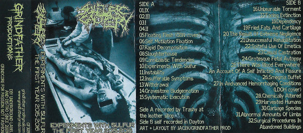 Tracklist: A1. IX, A2. III, A3. I, A4. II, A5. Floating Flesh, A6. Self Mutilation Fixation, A7. Rapid Decomposition, A8. Slaughterhouse, A9. Cannibalstic Tendencies, A10. Experiments With Sulfur, A11. Instability, A12. Insufferable Symptoms, A13. Withdrawal, A14. Gravestone Bludgeonation, A15. Systematic Execution, B1. Unbearable Torment, B2. Facing Extinction, B3. Dependency, B4. Fried Fats And Cartilage, B5. The Result Of Extreme Negligence, B6. Unsuccessful Rehabilitation, B7. Spiteful Use Of Emetics, B8. Casual Castration, B9. Grotesque Fetal Autopsy, B10. There Was Blood Everywhere / An Account Of A Self Inflicted Anal Fissure, B11. Smegma Buffet, B12. In Andvanced Hemorrhaging Conditions, B13. Chemically Altered, B14. Harvested Humans, B15. Garbage Species, B16. Abnormal Amounts Of Limbs, B17. Surgical Procedures In Abandoned Buildings