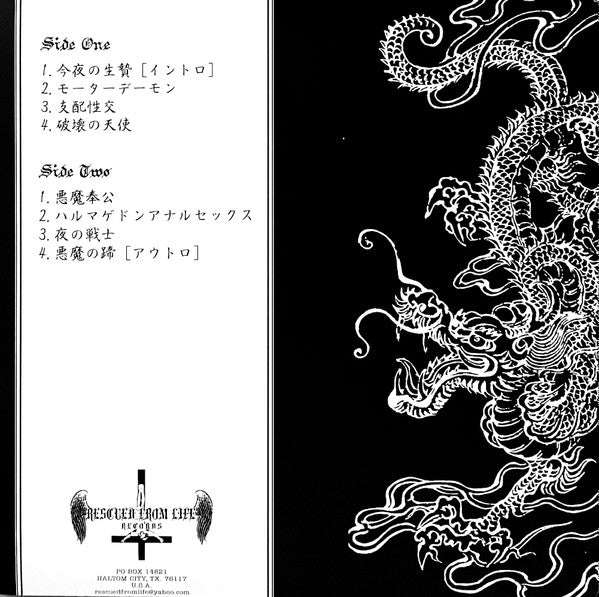 Tracklist: A1. 今夜の生贄 [イントロ], A2. モーターデーモン, A3. 支配性交, A4. 破壊の天使, B1. 悪魔奉公, B2. ハルマゲドンアナルセックス, B3. 夜の戦士, B4. 悪魔の蹄 [アウトロ]