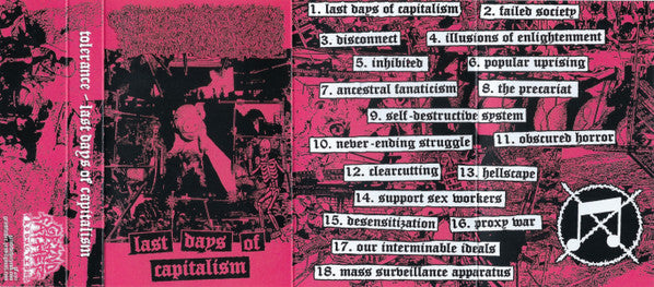 Tracklist: A1. Last Days Of Capitalism, A2. Failed Society, A3. Disconnect, A4. Illusions Of Enlightenment, A5. Inhibited, A6. Popular Uprising, A7. Ancestral Fanaticism, A8. The Precariat, A9. Self-Destructive System, B1. Never-Ending Struggle, B2. Obscured Horror, B3. Clearcutting, B4. Hellscape, B5. Support Sex Workers, B6. Desensitization, B7. Proxy War, B8. Our Interminable Ideals, B9. Mass Surveillance Apparatus
