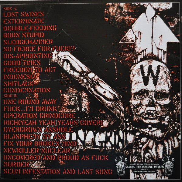 Tracklist: A1. Lost Swines, A2. Exterminate, A3. Double-Feeding, A4. Born Stupid, A5. Sledgehammer, A6. So Fierce For Fuck!?, A7. Dis-Appointing, A8. Good Times, A9. Freedom To Act, A10. Indonesia, A11. Shitlack, A12. Condemnation, B1. One Round Away, B2. Fuck...I'm Drunk, B3. Operation Grindcore, B4. Rich, B5. Overgrown Asshole, B6. Blasphemy My Ass, B7. Fix Your Broken Mind, B8. Newkiller Nuclear, B9. Uncovered And Proud As Fuck, B10. Murder, B11. Scum Infestation And Last Song
